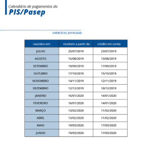 Os servidores públicos com o digito final de inscrição do Pasep de 0 e 4 também recebem este ano. Já no caso das inscrições com o final entre 5 e 9, o pagamento será no próximo ano. O fechamento do calendário de pagamento do exercício 2019/2020 será no dia 30 de junho de 2020.