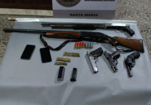 A Brigada Militar (BM) prendeu, na noite desta terça-feira (12), cinco indivíduos com armas de fogo e munições em Santa Maria. Além disto, o quinteto estava em um carro em situação de furto.
