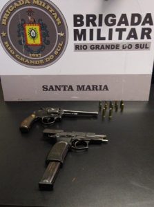 De acordo com a BM, a dupla, com idade 24 e 30 anos, estava em um veículo Gol na Rua João Lino Pretto, no Bairro Pinheiro Machado, quando os policiais do 1º Regimento de Polícia Montada (1ºRPMon) se aproximaram para uma abordagem e os suspeitos arrancaram com o carro.  Na ocasião, a dupla efetuou três disparos contra a guarnição da BM, que reagiu com tiros. O veículo Gol foi acompanhado até colidir em outros carros que estavam estacionados em via pública. Na ação, os policiais apreenderam uma pistola calibre 9mm municiada com 10 munições e um revólver calibre 38 municiado com 02 munições.