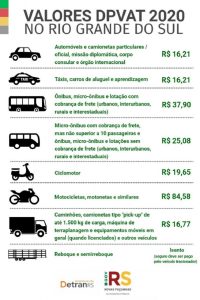 Os valores do seguro obrigatório Dpvat para o exercício de 2020 serão os mesmos praticados no ano passado. O congelamento da tabela foi uma orientação recebida pelo DetranRS do Departamento Nacional de Trânsito (Denatran).